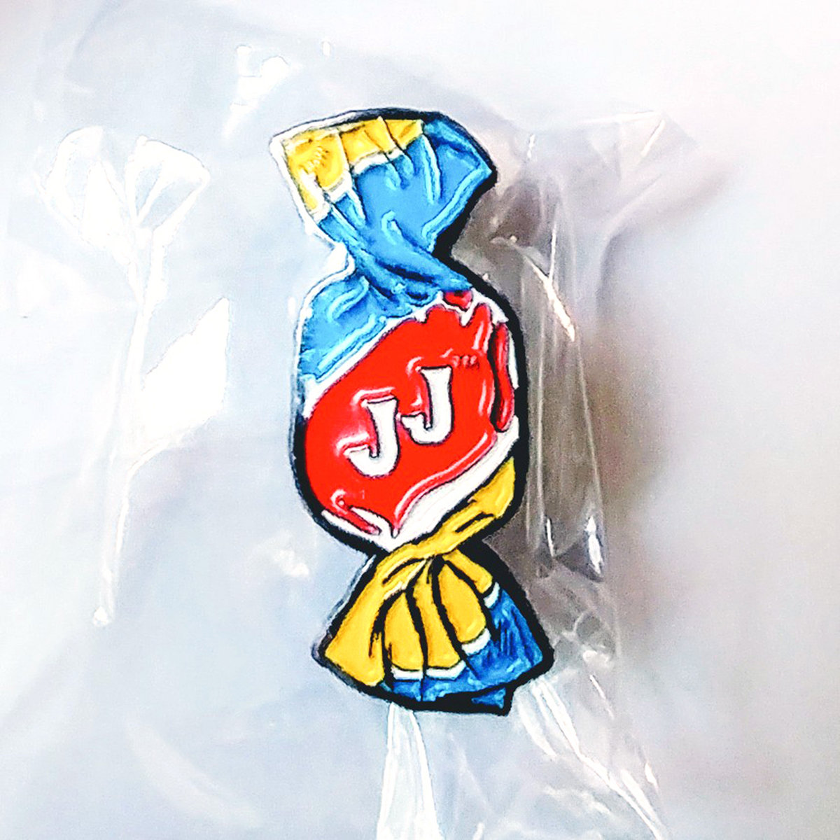 One four-color (red, white, yellow, blue) black soft enamel "CANDY" pin art by JJ.